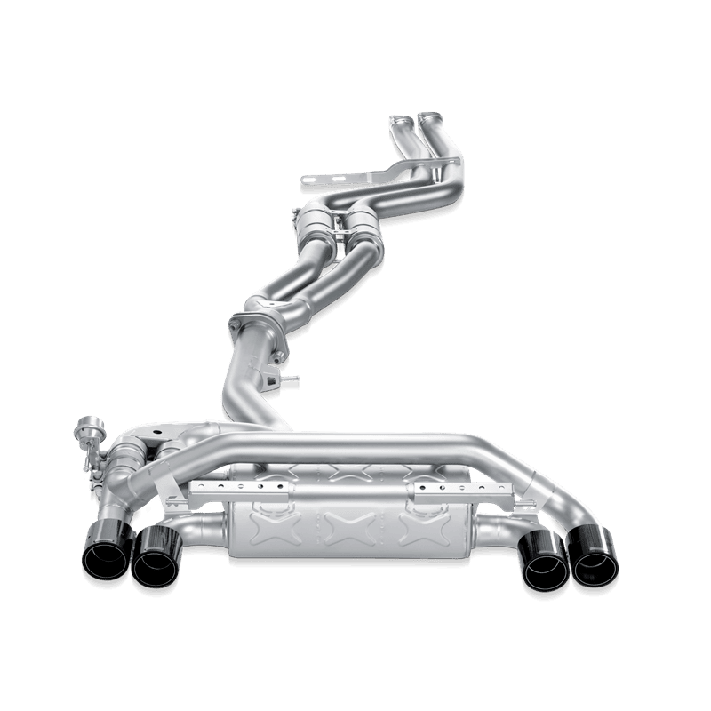 Our Evolution performance exhaust system, made of our proprietary titanium, includes a muffler, link pipes, and resonators that run from the stock down pipes back. These link pipes feature larger-than-stock-diameter tubing and cast titanium flanges. The secondary catalytic convertors are removed, further decreasing back pressure and weight while at the same time deepening the exhaust tone and increasing power output. For the ultimate in weight reduction, tuning potential, and aggressive racing sound, we offer optional stainless steel catless down pipes. For hardcore enthusiasts. Select the optional Akrapovic sound kit for adjustable sound. Complete the look with a set of four exquisite tailpipes in titanium or carbon fibre.
